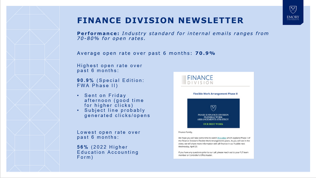 “Julia always delivers quality work. Julia works with a large volume of communication and website needs and is able to complete them on time. Her responsiveness and dependability are appreciated throughout the division.”